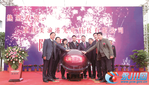 12月12日,重庆美渝港光电科技有限公司开业投产。图为投产仪式上,滕宏伟、罗清泉、陈小南、王志飞、刘祥全、张滨、王志国、孙健等共同启动开业水晶球。 记者 陈科儒 摄