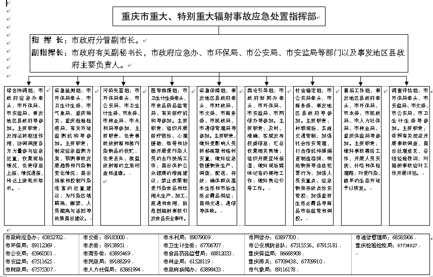 根据工作需要,在重庆市人民政府突发事件应急委员会统一领导下,在市政府应急办统筹协调下,在市事故灾难应急指挥部的基础上,成立重庆市辐射事故应急处置指挥部(以下简称市指挥部)。市指挥部实行指挥长负责制,由市政府分管领导同志担任指挥长,统一领导和组织重大、特别重大辐射事故应急处置工作。市指挥部下设综合协调、应急监测、污染处置、医学救援、应急保障、舆论引导、社会稳定、善后工作、调查评估等工作组(职责见附件)。